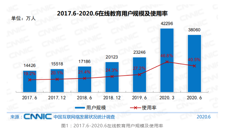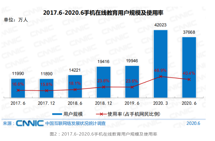 报告显示,截至2020年6月,我国在线教育用户规模达3.81亿,较2020年3月减少4236万,占网民整体的40.5%;手机在线教育用户规模达3.77亿,较2020年3月减少4355万,占手机网民的40.4%。