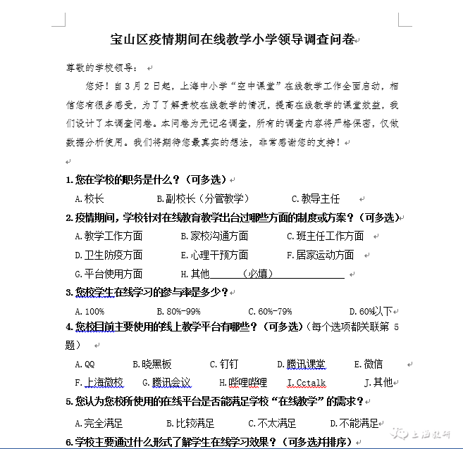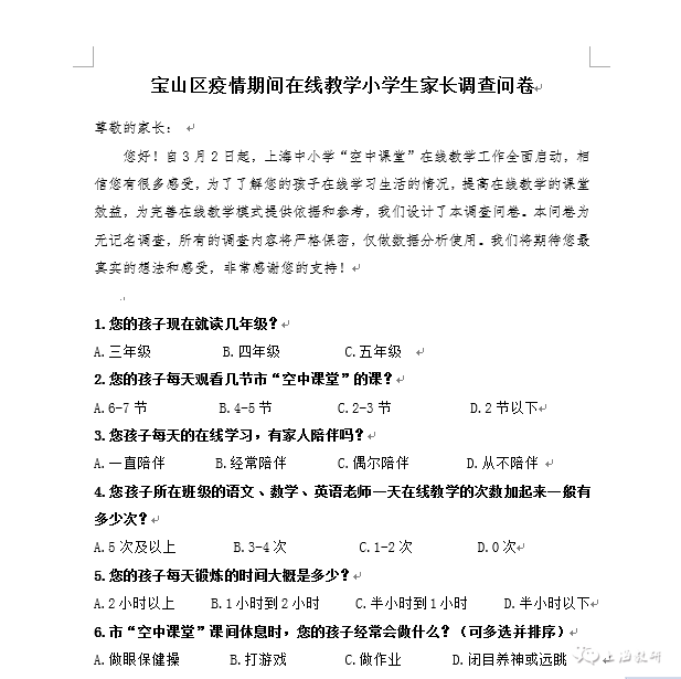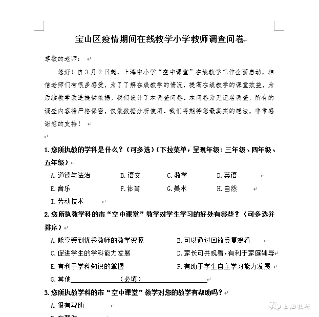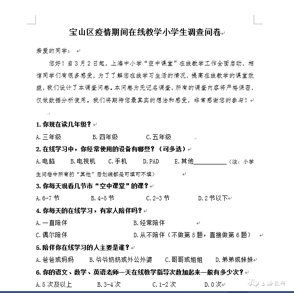 疫情初期,教研室组织开展小学阶段部分学校教导主任在线教学情况现场调研,针对大家反映的问题,研究拟订了各类调研问卷:宝山区疫情期间“在线教学”小学教师、领导、小学生和家长调查问卷。各科教研员针对调查问卷数据进行分析与反馈,围绕普遍性的问题,采取针对性的措施加以解决。如:小学英语学科针对在线教学中“师生交互”所面临的主要问题,初步形成了区域英语在线教学“师生交互”设计的基本路径、设计属性表及实施策略,为学校教师提供指引。