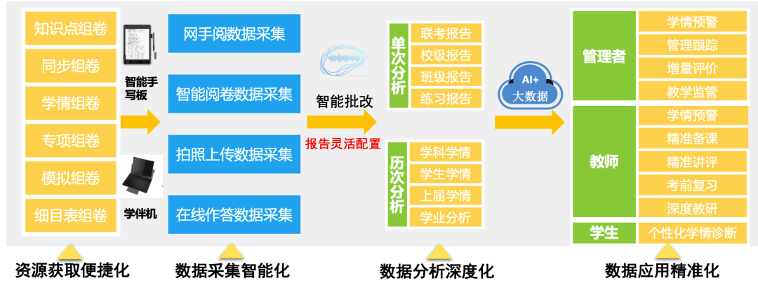 学校通过智能图像识别技术采集学生测评数据和教师批改结果。从群体、个体等多个维度进行综合分析,实时知晓各学科持续发展变化情况,优势、弱势、各班学生学业能力的均衡情况分布等信息。通过数据分析发现一定范围内共同存在的学习问题和教学薄弱的方面,根据分析结果设定科学的预警指标。通过预警指标和问题诊断分析,使老师更便捷的了解错误原因分布,了解卷中各知识点的达成情况,找出学生在学业中的短板。管理层可全面了解学校的整体学业质量情况,及时调整日常教学管理工作。老师可以更有针对性的安排自己的教学,根据学生的薄弱环节进行着重训练与讲解。