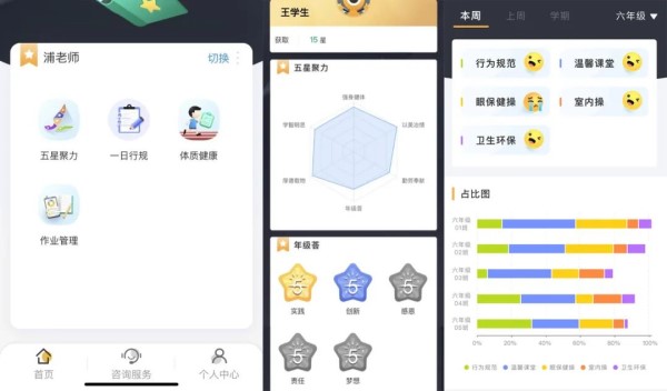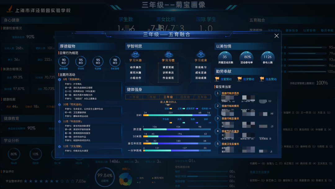 初中部将信息技术融入到《“五育融合 五星聚力”年级荟综合实践活动课程》的评价体系中,把课程内容和课程评价指标全面落户在数字平台上,打造 “五星”数字形象,作为每一位同学线上完成星级德育课程的标识,记录课程完成的等第。利用智慧平台搭建学生行为规范和教室卫生检查的记录、评比和反馈的全程管理系统,由初中部行政干部、班主任和自主管理委员会学生把每日学生从入校规范、在校规范到五项管理、课后服务等检查结果通过APP进行记录和反馈,用采集数据的分析来调整教育方式和决策,督促改进,更有效促进学生行为规范教育的实效。