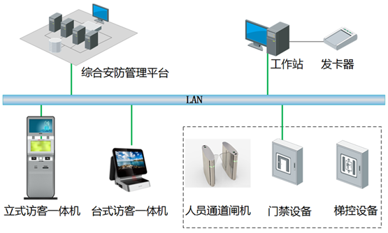 访客系统主要由访客一体机、管理终端、中心管理平台组成,并可与人脸闸机系统、人脸门禁系统等进行整合,对访客身份进行有效确认,并管控访客的进出区域。