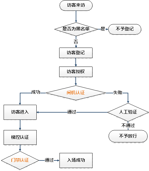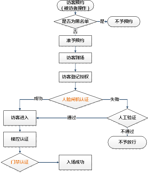 访客系统根据流程分主要由访客预约、访客登记、访客到访和访客签离四部分构成。具体工作流程如下: