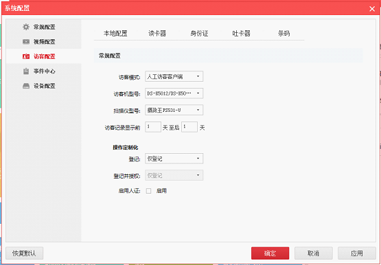 访客CS客户端提供访客模式、访客机型号、打印访客单、自助发卡等本地配置,通过本地配置可实现设备切换及人工访客客户端、自助访客客户端等模式的切换。