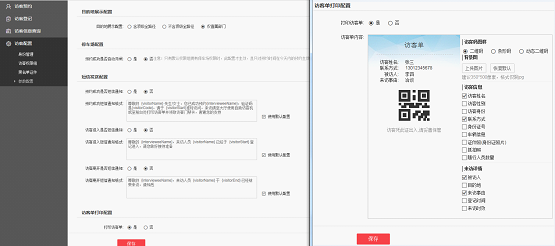 访客配置功能包括访客目的地展示配置、访客短信信息模板配置、访客打印单配置(可选择需要打印的访客信息)、访客单背景图片配置,访客刷卡最大次数配置。