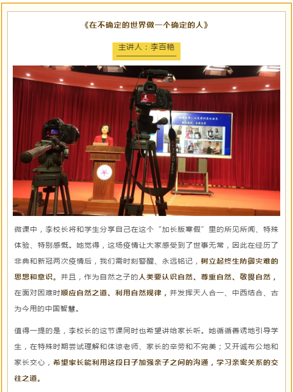 “同学们,现在的你们还不能像医务工作者那样奋不顾身冲锋陷阵,也不能像科研工作者那样日以继夜研制药物,那么你们能做什么呢?除了做好自我保护、自我防疫,你们心里一定要秉持一个高远的志向,无论志向的具体内容是什么,其中一定要有大爱、要有情怀、更要有祖国和人民。”