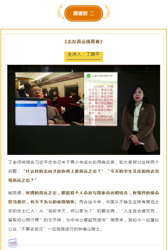 除了市里统一的课程安排,新区教育主管部门还精心准备了在线“德育第一课”,今天中午已通过“浦东德育”微信号进行推送。