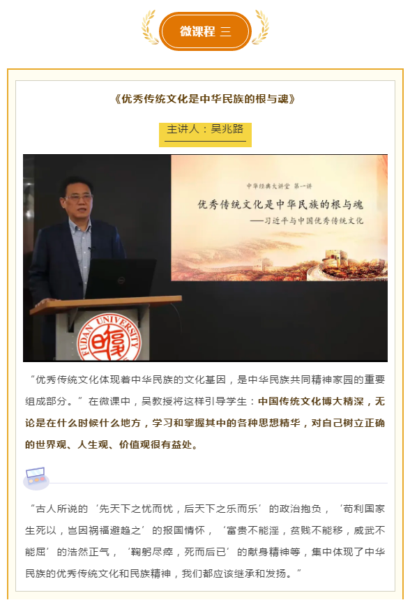 这三节微课程课分别由沪上3位名师开讲,他们分别是:复旦大学中文系副主任、中国学研究中心主任吴兆路教授,上海市正高级教师、上海市建平实验中学校长李百艳和上海市杨思高级中学语文骨干教师丁路平。