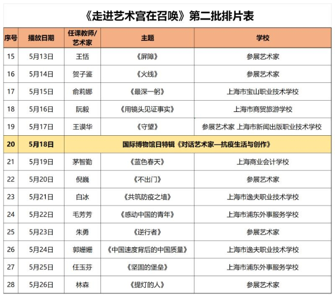 记者从上海市教委了解到,继第一期课程收到师生欢迎后,第二批排片表也新鲜出炉:结合博物馆日,对话艺术家石至莹、鲁丹,谈谈抗疫生活与创作;在复学复课的背景下,上海商业会计学校茅智勤的心理课《蓝色春天》为广大学子做心理调适,排忧解难。